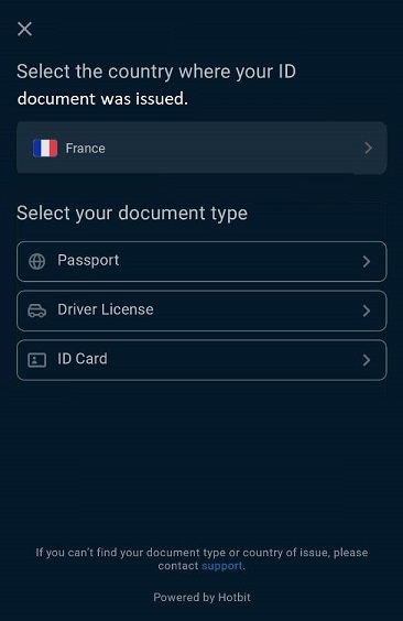 حال، کشوری را که در آن اقامت دارید را به همراه نوع مدرکی که در آن کشور صادر شده (پاسپورت، گواهینامه رانندگی یا آیدی کارت) را انتخاب کرده و به بخش گرفتن عکس و بارگزاری تصویر بروید.