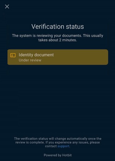 پس از این مرحله، حدود ۲ دقیقه زمان نیاز است تا مدارک ارسالی مورد تایید قرار گرفته و احراز هویت شما در صرافی هات بیت تکمیل شود.