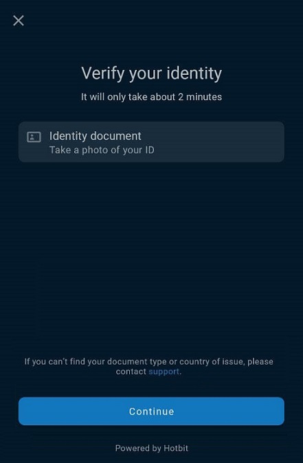 حال با پیام «Verify your identity» روبرو میشوید. در این بخش میبایستی یک تصویر از مدرک هویتی خود آماده کرده و بر روی Continue کلیک کنید.